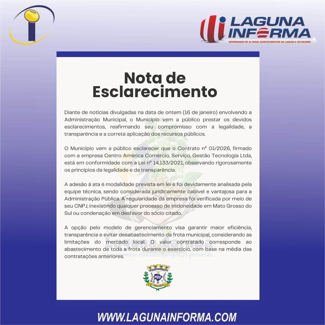 A Prefeitura de Laguna Carapã se manifestou por meio de nota oficial, nesta quinta-feira (16), para esclarecer informações que circularam recentemente envolvendo a Administração Municipal.